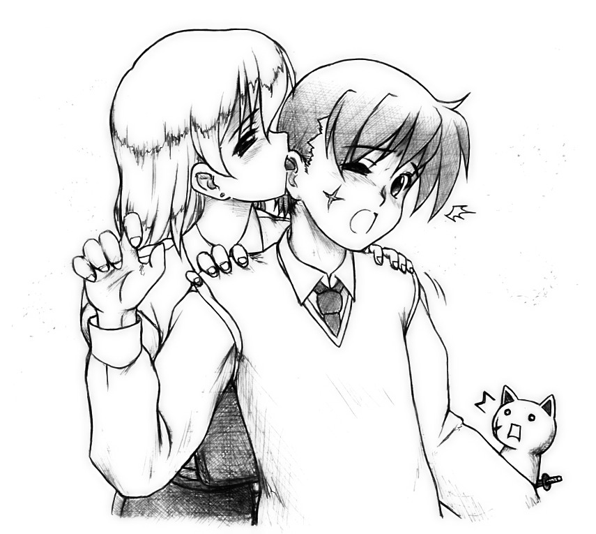 1boy1girlblushcatcollared shirtear lickingearringsfacial scargreyscalehands on another's shouldersjewelrykatanakissing earlickinglooking at anothermonochromenecktieo oone eye closedscarscar on cheekscar on facesheathsheathedshirtshort hairsimple backgroundstandingstud earringssurprisedsweater vestswordupper bodyweaponwhite background
