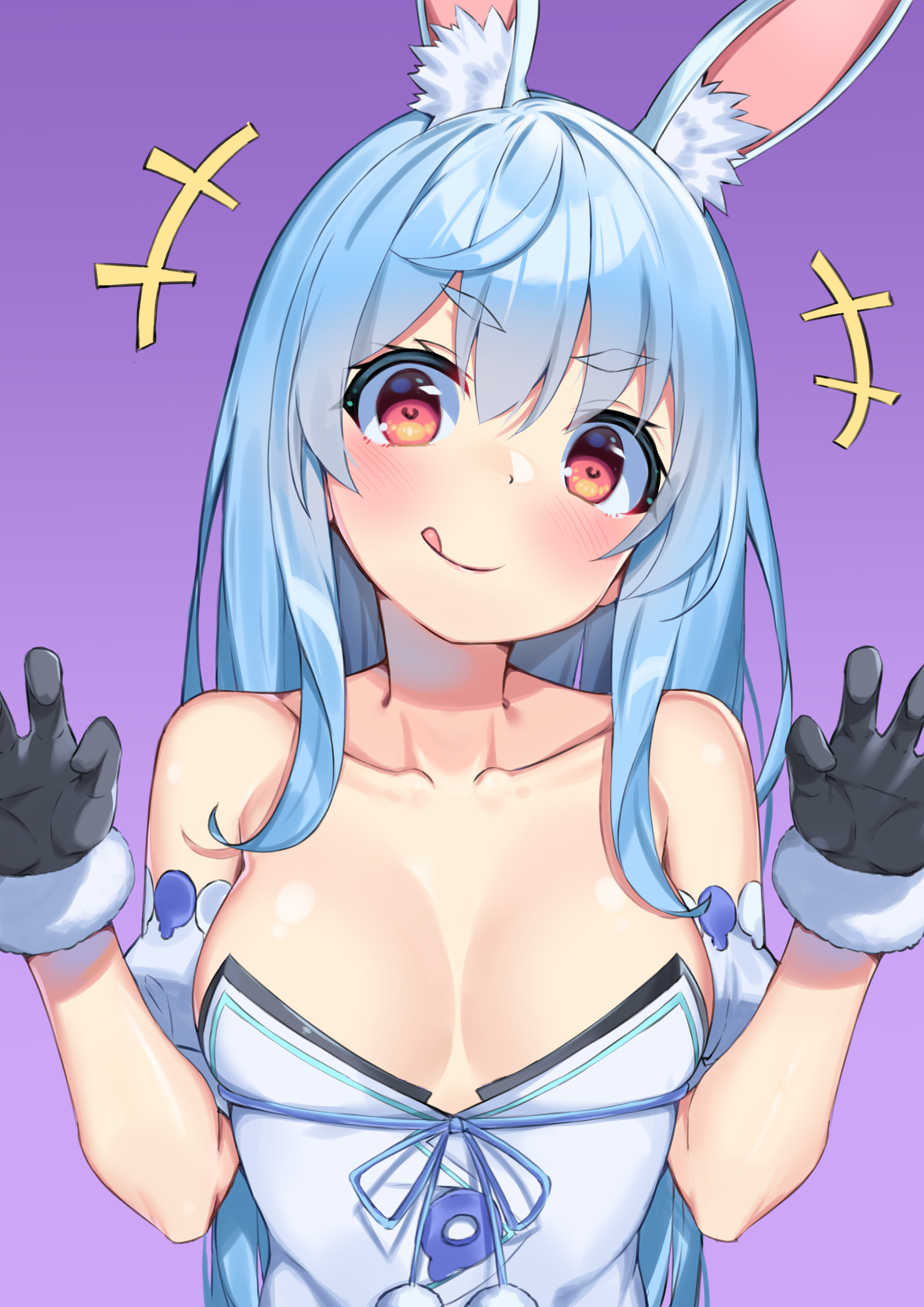 :q1girlanimal ear fluffanimal earsbare shouldersblack glovesblue hairblushbreastsclaw poseclosed mouthcollarbonedetached sleevesdressfur trimfur-trimmed glovesglovesgradient backgroundhair between eyeshands uphead tiltlong hairlooking at viewermedium breastspom pom (clothes)puffy short sleevespuffy sleevespurple backgroundrabbit earsred eyesshort eyebrowsshort sleevessimple backgroundsmilesolostraight hairstraplessstrapless dresstonguetongue outupper bodyv-shaped eyebrowsvirtual youtuberwhite dresswhite sleeves