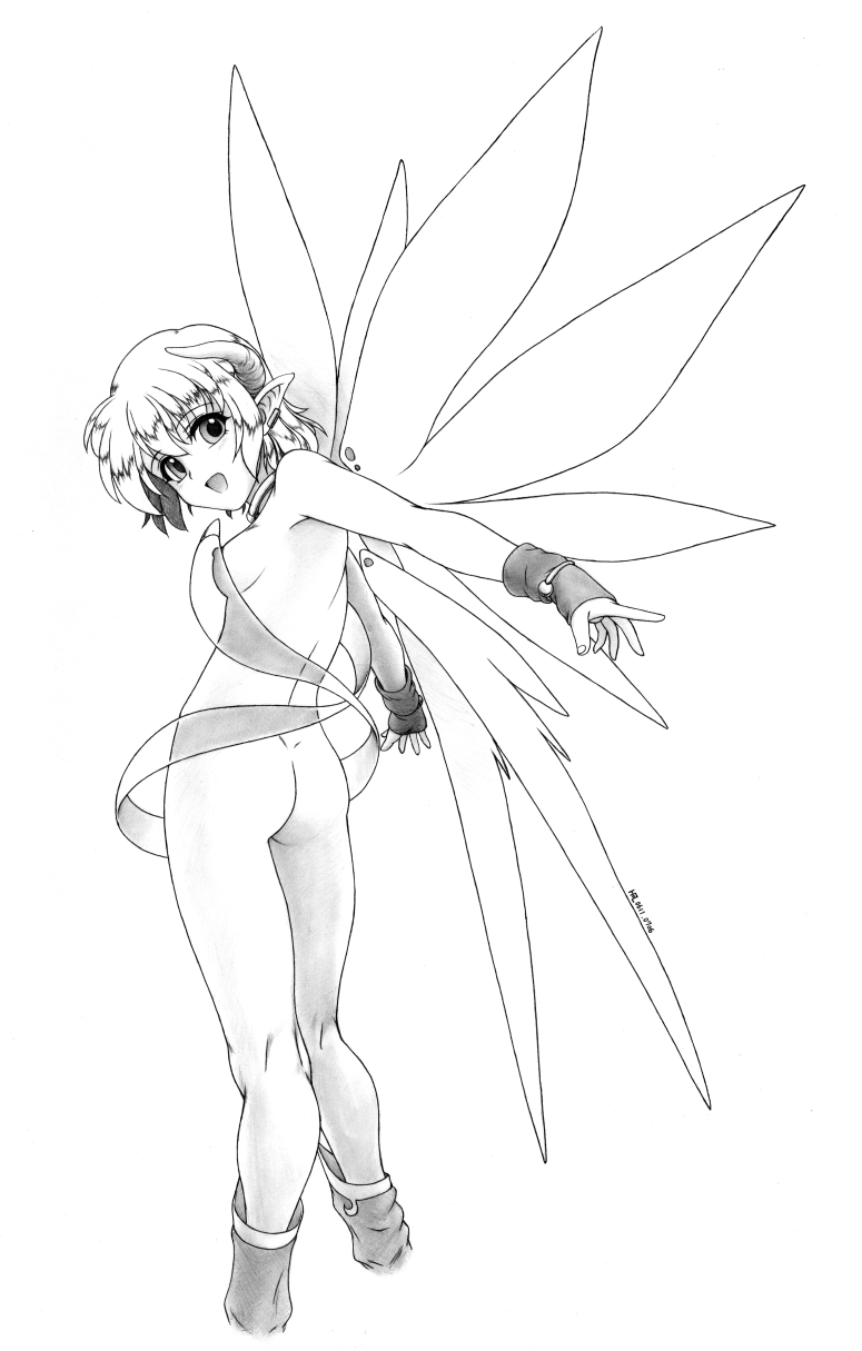 1girlassbootsbreastsfemale focusfull bodygreyscalehornslooking backmonochromenipplesnudepointy earsshort hairsmall breastssmilesolostandingwingswristband