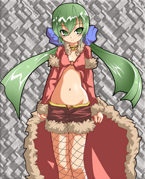 00s1girlbowfemale focusfishnet pantyhosefishnetsgreen eyesgreen hairlong hairlowlegmatching hair/eyesmidriffnavelopen flypantyhosepantyhose under shortsshortssolothighhighsunzippedzipper