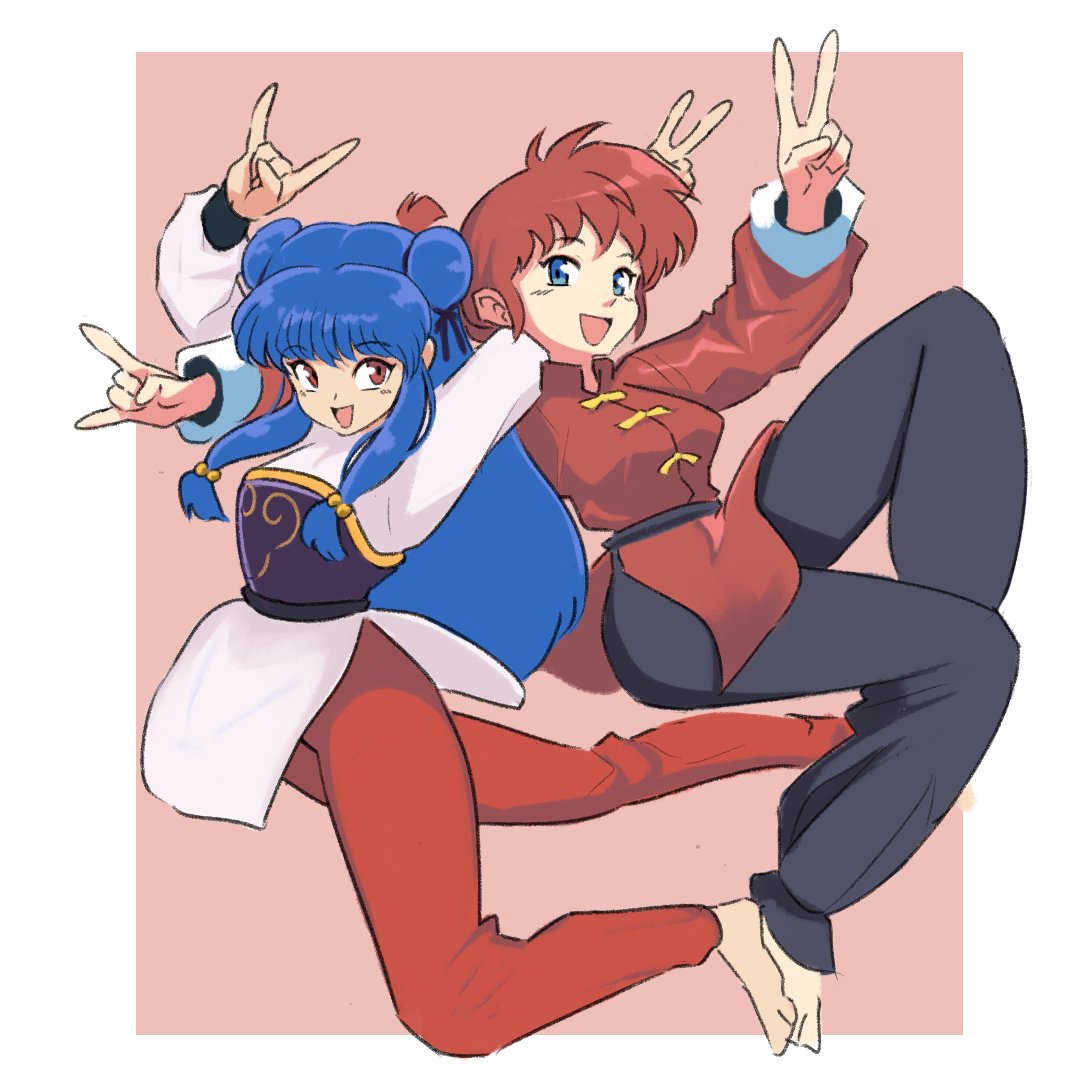 2girlsbarefootblack pantsblue hairbraidchinese clothesdouble bunhair bunlooking at viewerm/multiple girlspantsred hairred pantsred shirtshirtsidelocksv