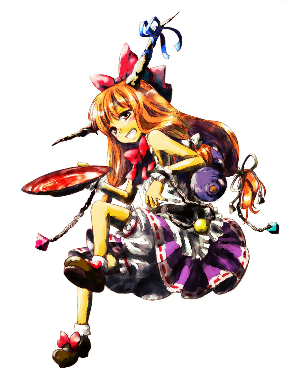 1girlalcoholchaincupfemale focusfull bodygourdhornslong hairorange hairribbonsakazukisakesimple backgroundsolowhite background