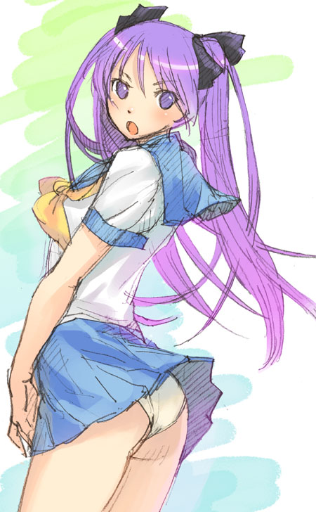 00s1girlassblushfemale focushair ribbonlong hairlooking backopen mouthpantiespantyshotpleated skirtpurple eyespurple hairribbonschool uniformserafukusketchskirtsolosurprisedtsurimetwintailsunderwearwhite pantieswindwind lift