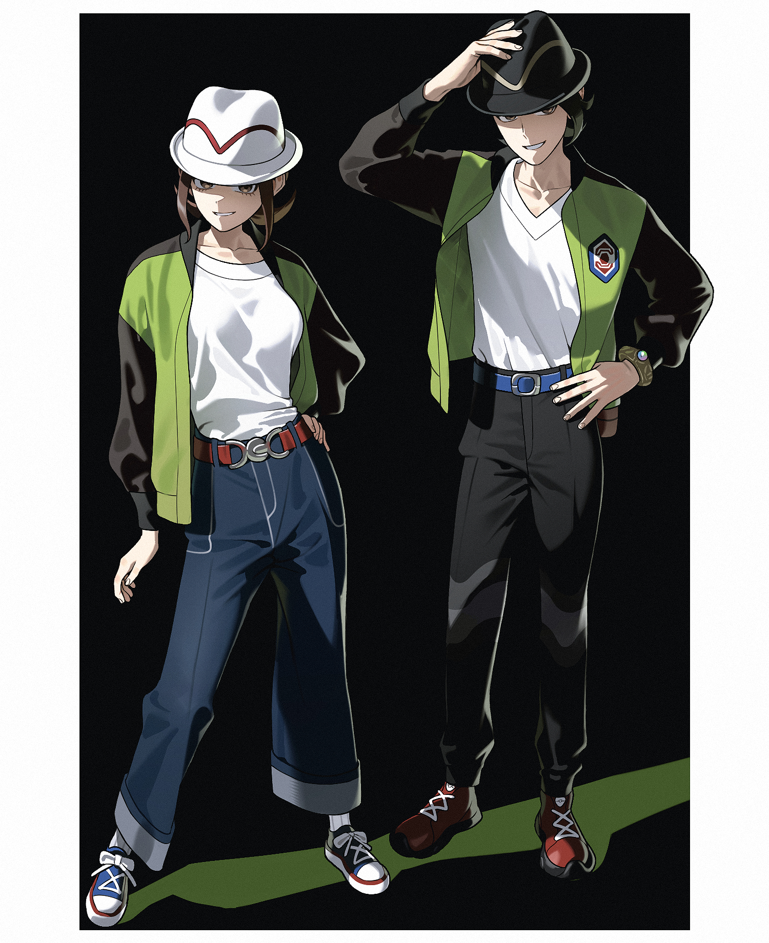 1boy1girlbell-bottomsbeltblack backgroundblack hairblack hatblack pantsblue beltblue pantsbreastsbrown eyesbrown hairfull bodygreen jacketgrinhatjacketlong sleeveslooking at vieweropen clothesopen jacketopen mouthpantsshirtshoesshort hairsimple backgroundsmilestriped hatwhite hatwhite shirt