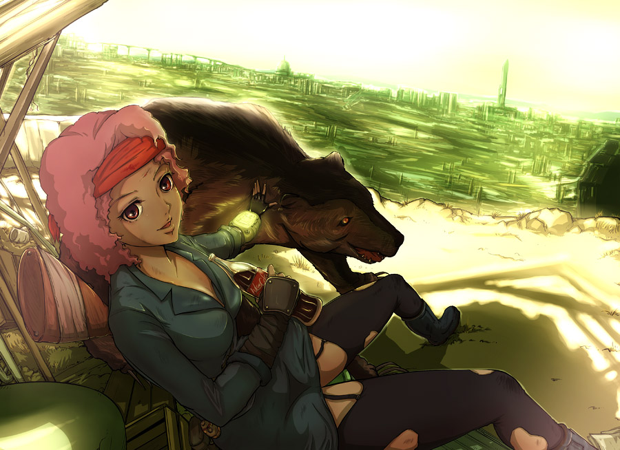 eidis scarlet, evernight (honkai: star rail), march 7th (honkai: star rail), honkai: star rail, honkai (series), no i'm not a human, commentary, english commentary, highres, 1girl, black choker, breasts, buttons, choker, dialogue options, earrings, flower, green theme, hair between eyes, jewelry, medium hair, off shoulder, official alternate eye color, outdoors, parted lips, porch, pov peephole, red eyes, single earring