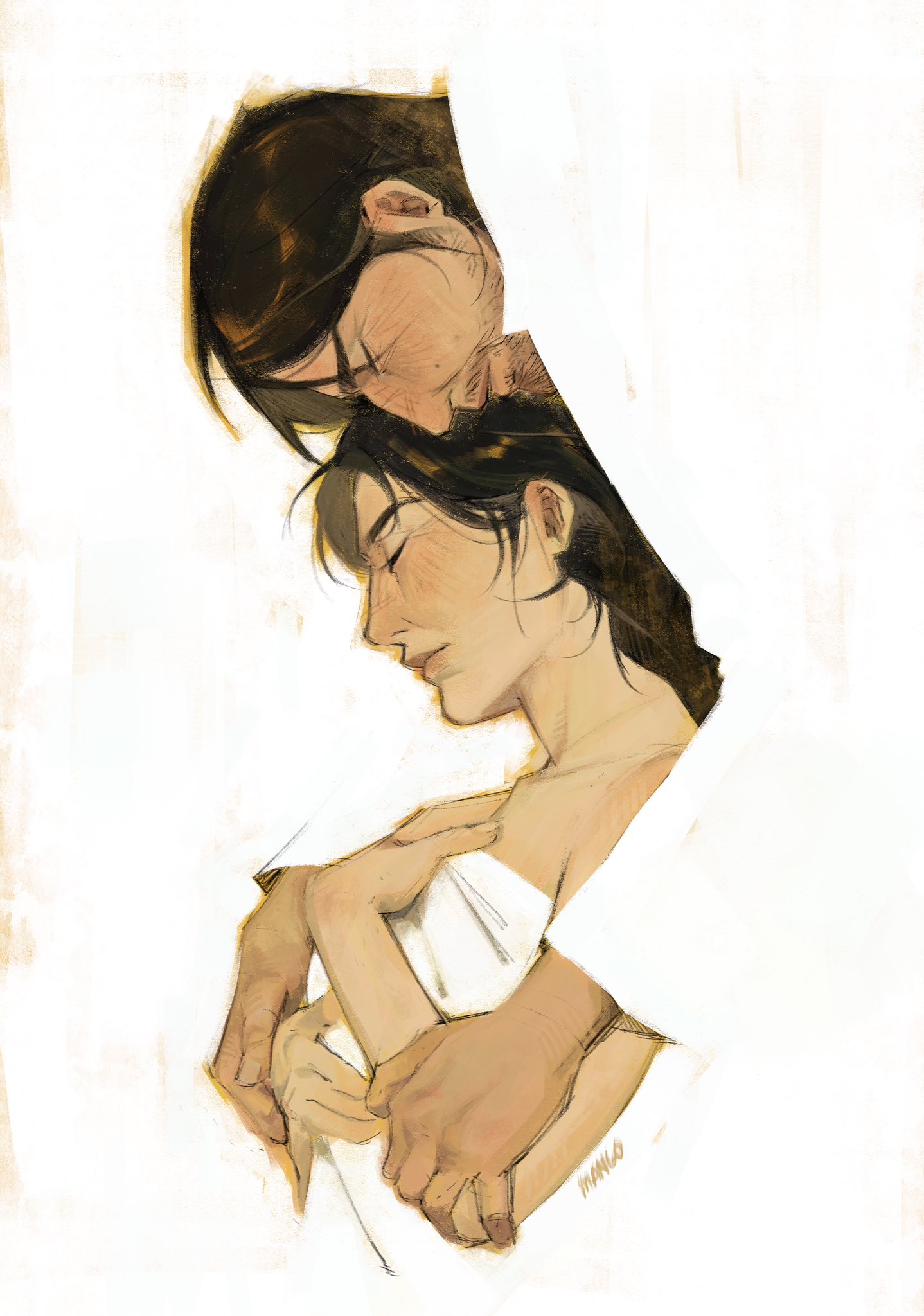 1boy1girlartist namebeardblack hairbrown hairclosed eyesclosed mouthcouplefacial hairhair between eyesheterohughug from behindlong hairmangowzzmature malemedium hairnegative spaceprofileupper bodywhite backgroundwrinkled skin