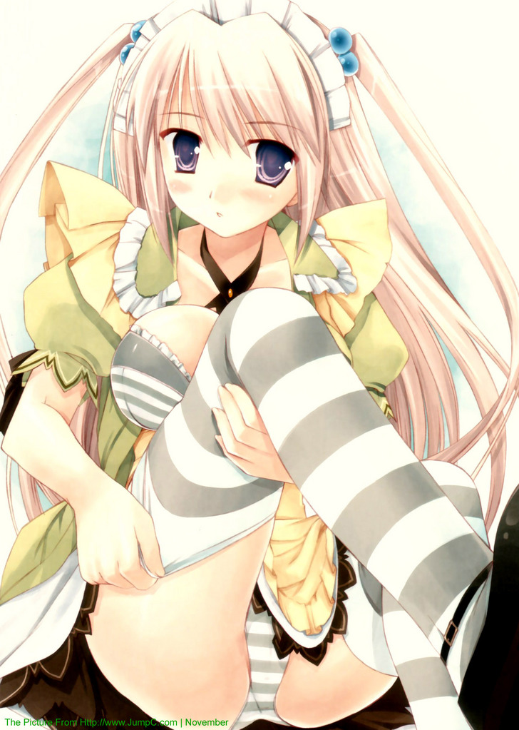 1girladjusting clothesadjusting legwearblonde hairblue eyesbrabreastscleavagedressingfemale focuslingeriemaidpantiessolostriped brastriped clothesstriped pantiesstriped thighhighsthighhighsunderwear