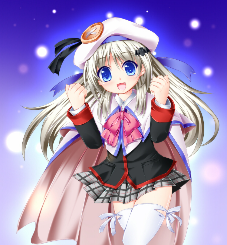 1girlblonde hairblue eyesbowcapefangfemale focushatlong hairpink bowplaid clothesplaid skirtschool uniformskirtsolothighhighs