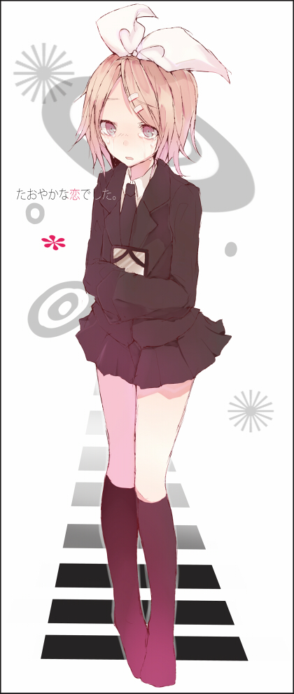 1girlblack borderblack jacketblack necktieblack skirtblack socksblonde hairblushbordercollared shirtconcentric circlescryingcrying with eyes openfemale focusfull bodyhair ornamenthair ribbonhaircliphands in opposite sleevesholdingjacketkneehighslong sleeveslooking at viewerminiskirtnecktieno shoesopen mouthpleated skirtribbonschool uniformshirtshort hairsimple backgroundskirtsockssolostandingswept bangstearswhite backgroundwhite ribbonwhite shirtwing collar
