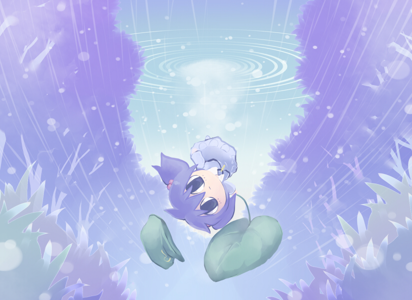 1girlblack eyesblue hairchibiexpressionlessfemale focusfrom belowhair bobbleshair ornamenthatleaflooking upnatureslit pupilssolotwintailsunderwaterunworn hatunworn headwear