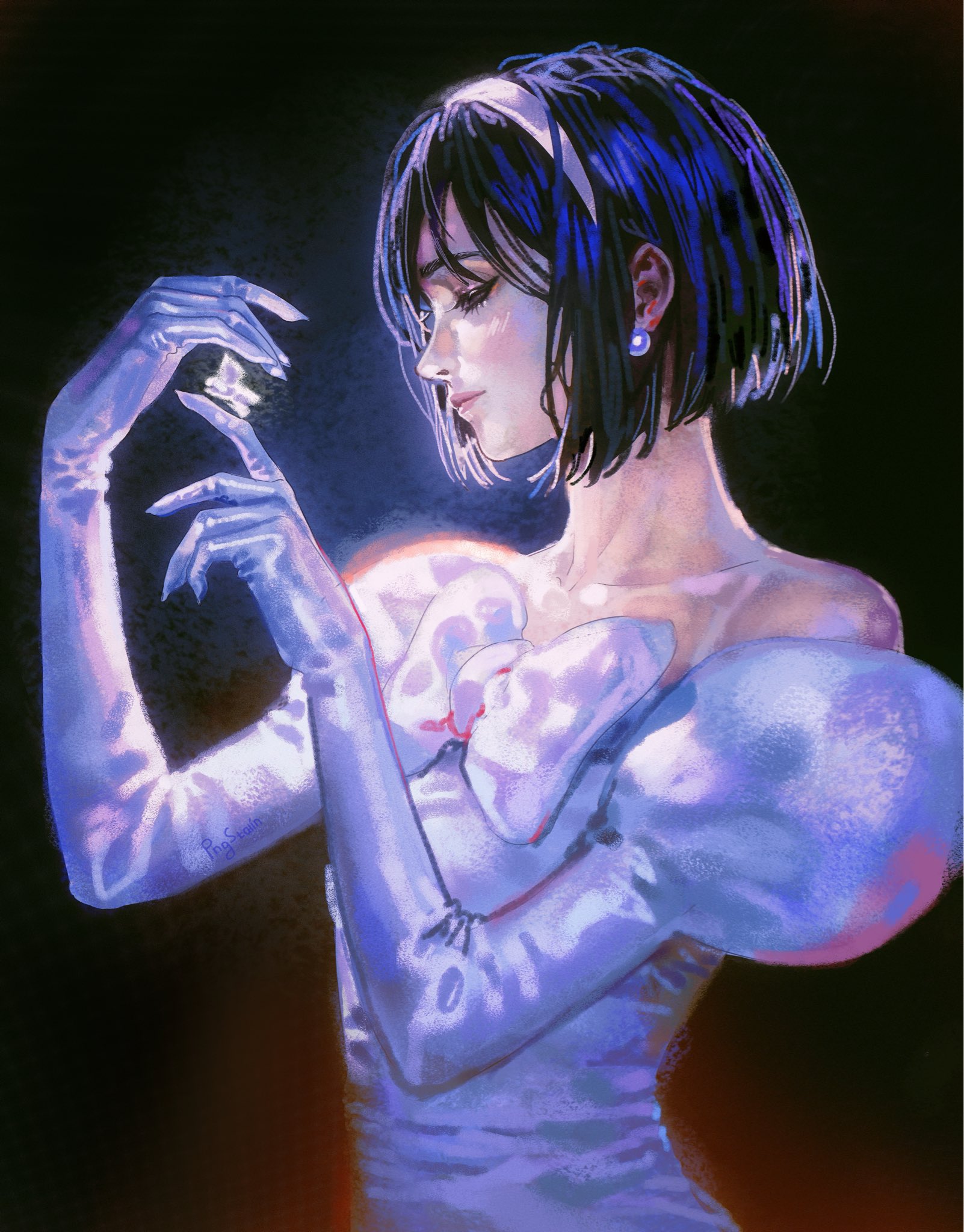 taykrome, blade (honkai: star rail), himeko (honkai: star rail), kafka (honkai: star rail), honkai: star rail, honkai (series), commentary, english commentary, highres, 1boy, 2girls, aiming, anger vein, angry, artist name, bandaged arm, bandages, bandages over clothes, black-framed eyewear, black choker, black coat, black gloves, black jacket, blush stickers, chinese clothes, choker, closed mouth, clothing cutout, coat, collared shirt, dated, dress, earrings, eyewear on head, from side, gloves, gold earrings, golden rose, gun, hair between eyes, hand up, holding, holding gun, holding weapon, jacket, jewelry, long hair, long sleeves, looking at another, multiple girls, multiple views, notice lines, open clothes, open jacket, pink lips, pink pupils, pointing, ponytail, puffy long sleeves, puffy sleeves, purple eyes, purple gloves, purple hair, red hair, round eyewear, shirt, sidelocks, simple background, single earring, sleeveless, sleeveless dress, solo focus, spider web print, sunglasses, teeth, upper body, v-shaped eyebrows, wavy hair, weapon, white background, white dress, white shirt, yellow eyes