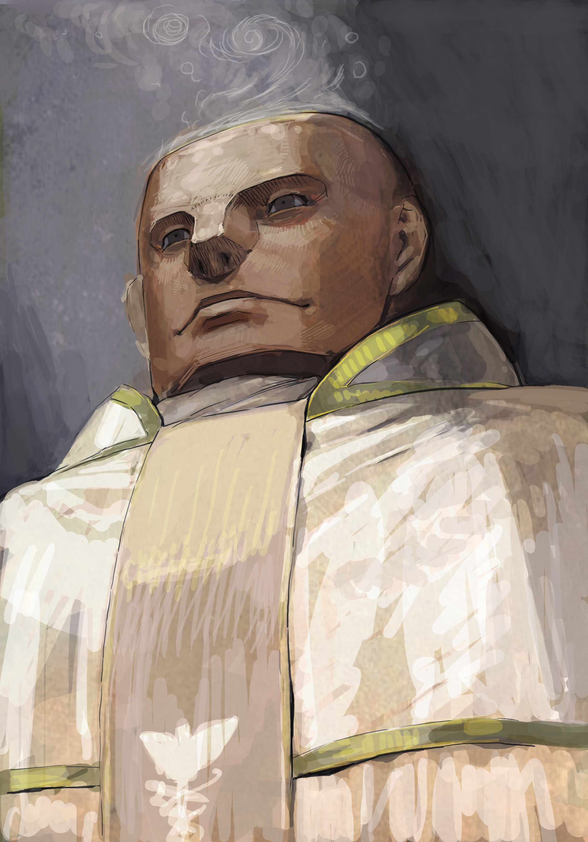 otogisum3, ametsukana yago, len'en, 1other, androgynous, annoyed, bandage over one eye, brown hair, cape, creature, creature on shoulder, cropped torso, crossed arms, gouged eye, green cape, hexagram, holding, holding sword, holding weapon, japanese clothes, kimono, long sleeves, looking at creature, mask, mask on head, noh mask, on shoulder, other focus, parted lips, patchwork clothes, red eyes, red kimono, red mask, rope, shide, shimenawa, short hair, simple background, solo, squiggle, star of david, sword, weapon, white background, wide sleeves