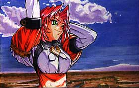 1girlarms upbodysuitbreastsclouddesertfemale focuslarge breastsorange hairoutdoorsred hairskysmirksolo
