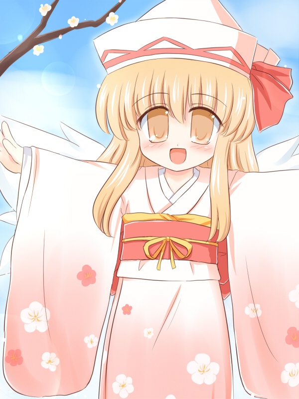 1girlblonde hairfemale focushatjapanese clotheskimonolong hairmatching hair/eyesorange eyesorange hairoutdoorsoutstretched armsskysolospread arms