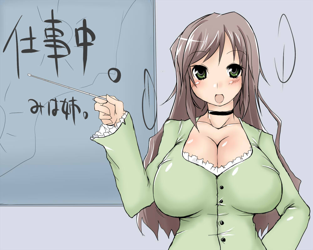 10s1girlblushbreastsbrown hairchokercleavagecollarfemale focusgreen eyesgrey hairhuge breastsindoorslong hairopen mouthpointersoloteacher