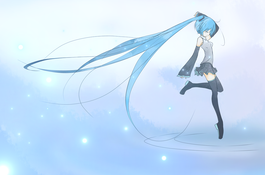 1girlblue hairclosed eyesdetached sleevesfemale focuslong hairskirtsolothighhighstwintailsvery long hair