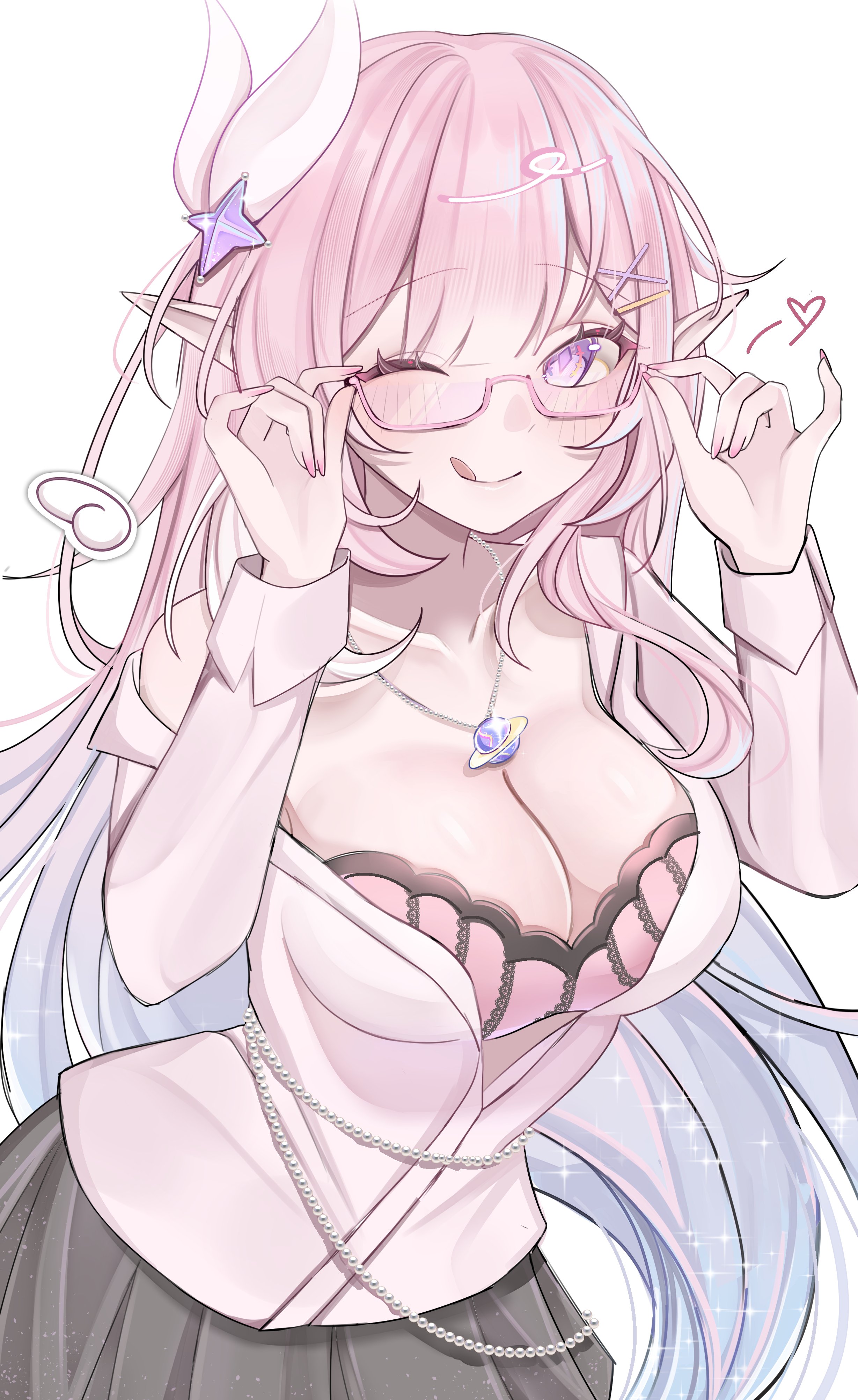 :p1girladjusting eyewearalternate costumeaqua hairblack skirtbrabreastsdiamond (shape)diamond-shaped pupilsglassesgradient hairhair ornamentlarge breastslicking lipslong hairlooking at viewermedium breastsmulticolored hairone eye closedpink brapink hairpointy earspurple eyesshirtsimple backgroundskirtsolosymbol-shaped pupilstonguetongue outunderwearvery long hairwhite backgroundwhite hairwhite shirt