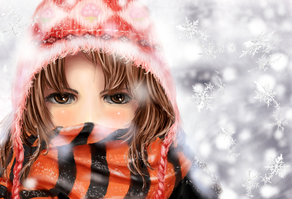 1girlbrown eyesbrown hairearflap hatfemale focushatknittedscarfsnowsolostriped clothesstriped scarf