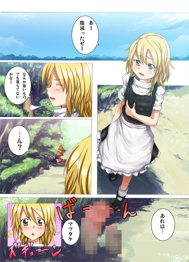 1girlblonde haircensoredcensored foodcomicfake censorfemale focusmushroomno headwearoutdoorssexually suggestive