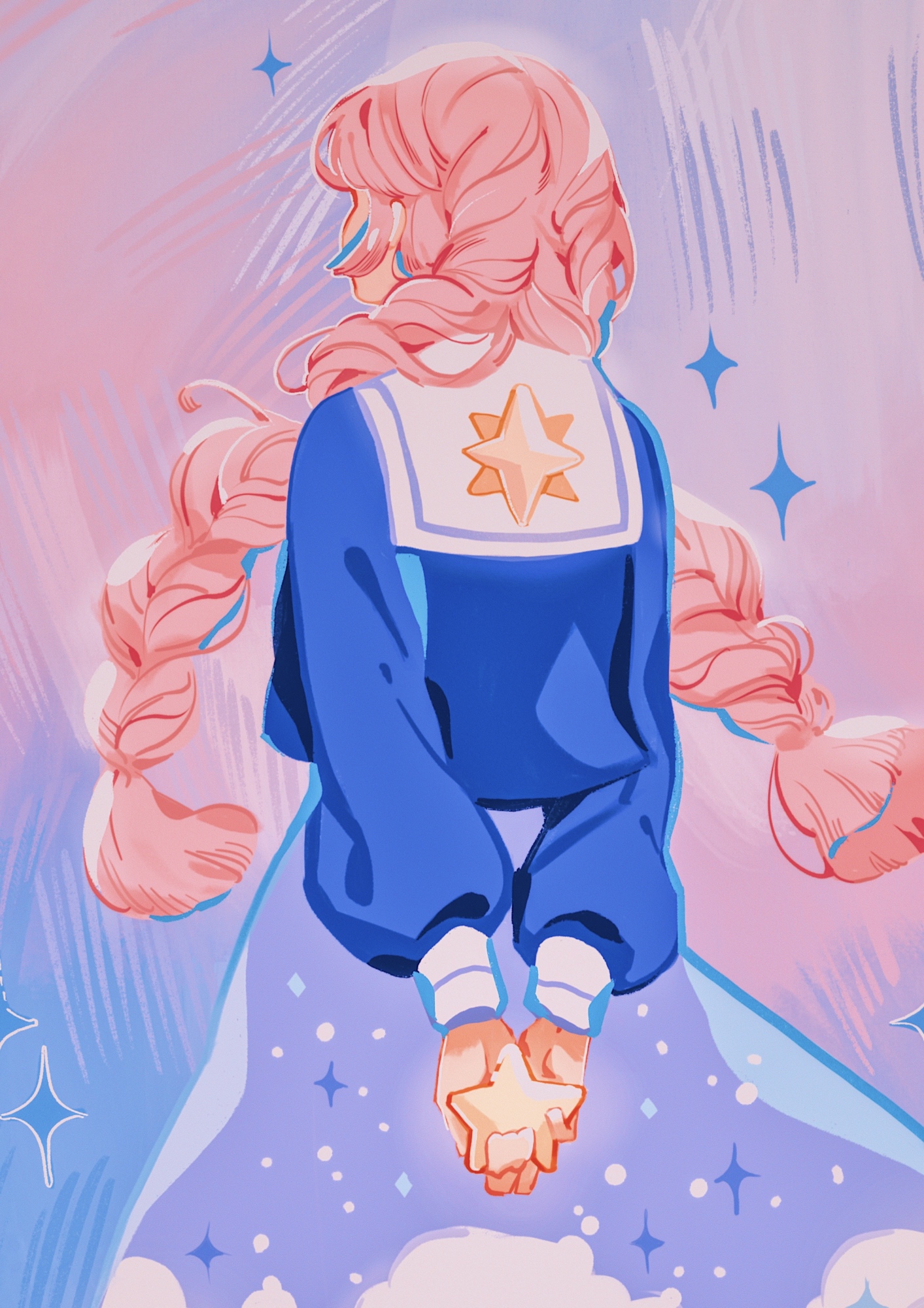 1girlarms behind backblue backgroundblue shirtblue skyblunt bangsblunt endsblunt sidelocksbraidcloud printcowboy shotdayfrom behindholdingholding starlong hairlong sleevesmedium skirtmulticolored hairpink backgroundpink hairpurple backgroundsailor collarshirtsidelocksskirtskysky printsolosparklestar (symbol)streaked hairtwin braidsvery long hairwhite sailor collar