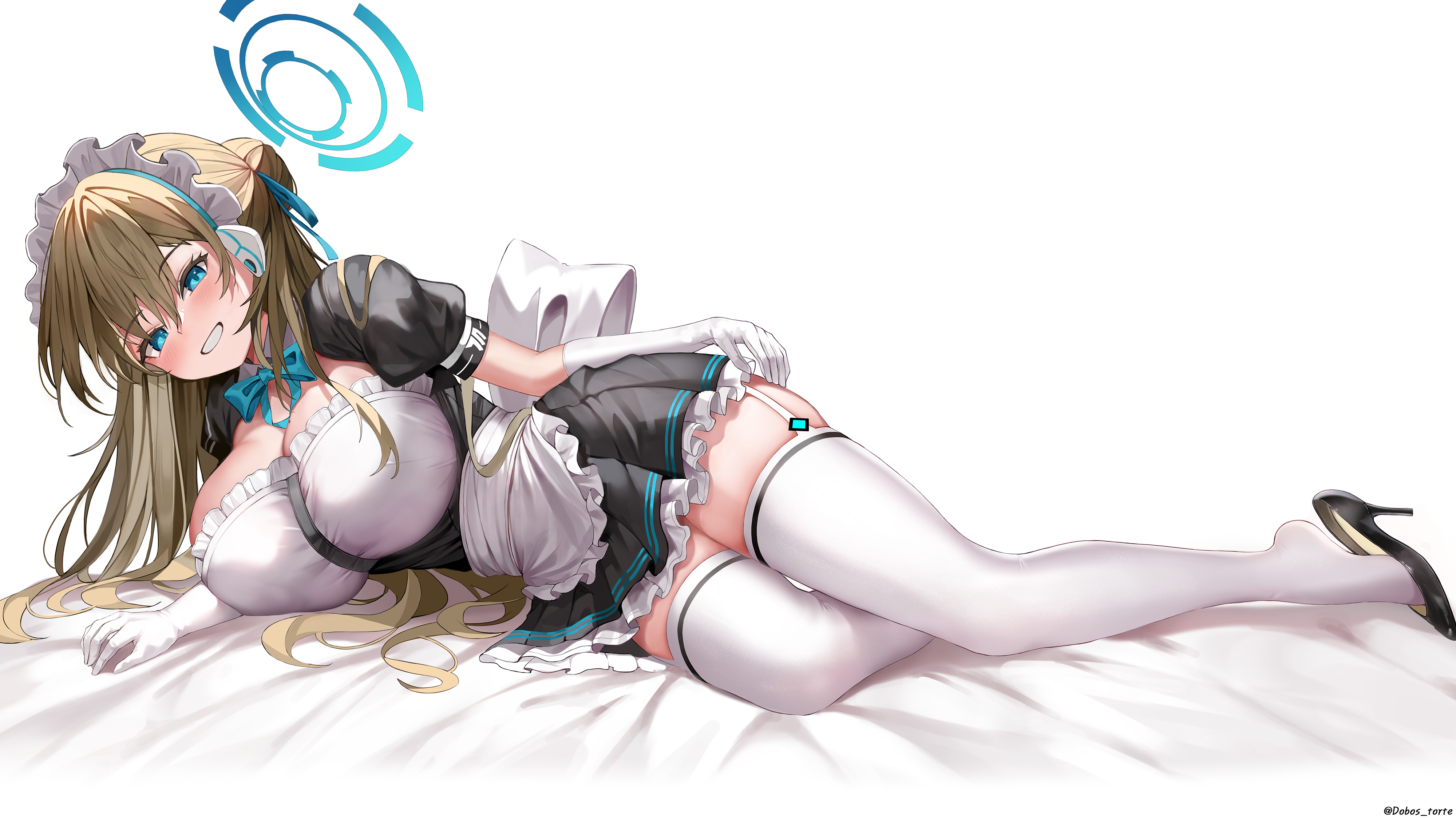 1girlapronblack dressblack shoesblonde hairblue eyesblue haloblushbreastscleavagedressgarter beltglovesgrinhair between eyeshair over one eyehalohigh heelshuge breastslong hairlooking at viewerlyingmaidmaid apronmaid headdresson sideshoessmilesolothick thighsthighhighsthighswhite garter beltwhite gloveswhite thighhighszettai ryouiki