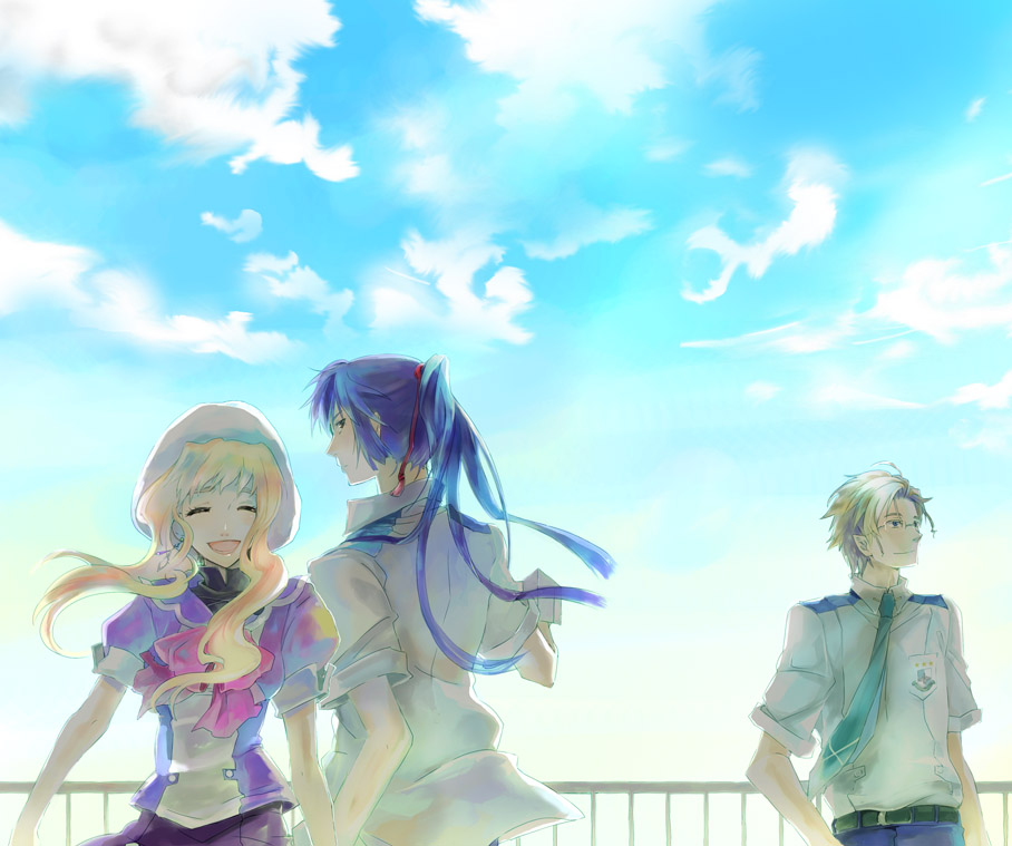 poteto (potetosarada123), mythra (xenoblade), nia (blade) (xenoblade), nia (xenoblade), pyra (xenoblade), rex (xenoblade), xenoblade chronicles (series), xenoblade chronicles 2, absurdres, commentary request, highres, 1boy, 3girls, back-to-back, black hair, blonde hair, bob cut, brown eyes, closed mouth, earrings, eyelashes, grey hair, jewelry, looking up, multiple girls, red hair, short hair, sidelocks, smile, spiked hair, yellow eyes