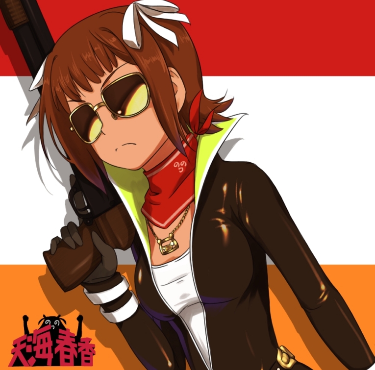 saki chisuzu, vehicle, adapted uniform, blonde hair, glasses, green eyes, japanese clothes, miko, motor vehicle, motorcycle, skirt, solo, standing, thighhighs