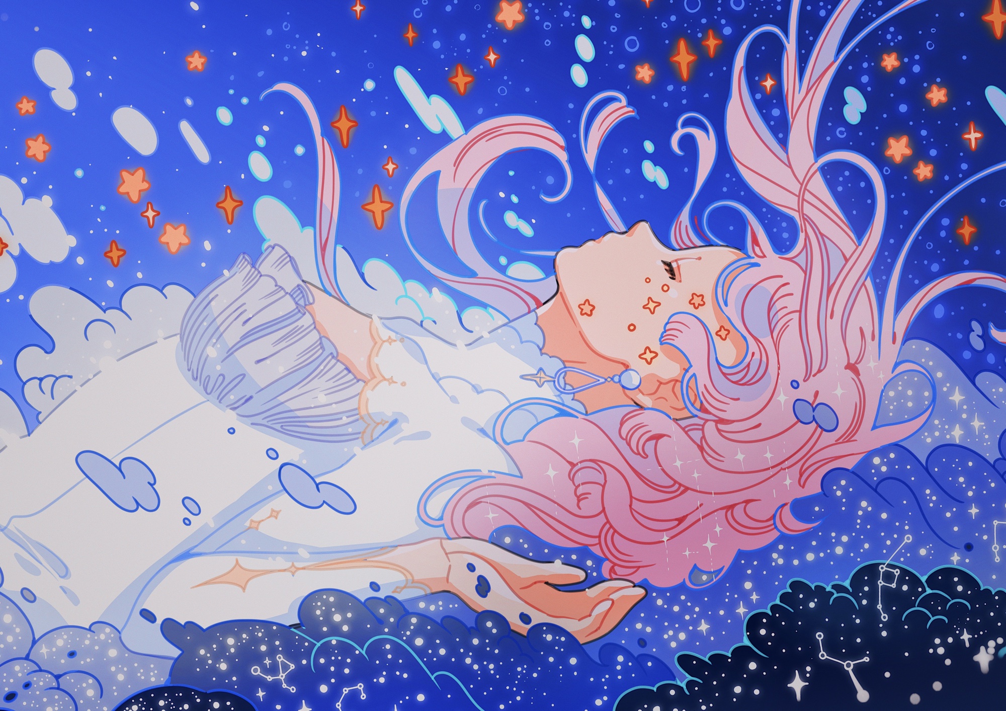 1girlabove cloudsblue backgroundblue cloudsblue skycleavage cutoutclosed eyesclothing cutoutcloudcloud printconstellationdresseyelashesfloating hairfrom sidehands upjewelrylong hairlong sleeveslyingnighton backon cloudoutdoorsparted lipspink hairprofileshrug (clothing)skysolosparklestar (sky)star (symbol)star stickerstarry skystickersticker on facetoo many starsturtleneckwavy hairwhite dresswhite shrug