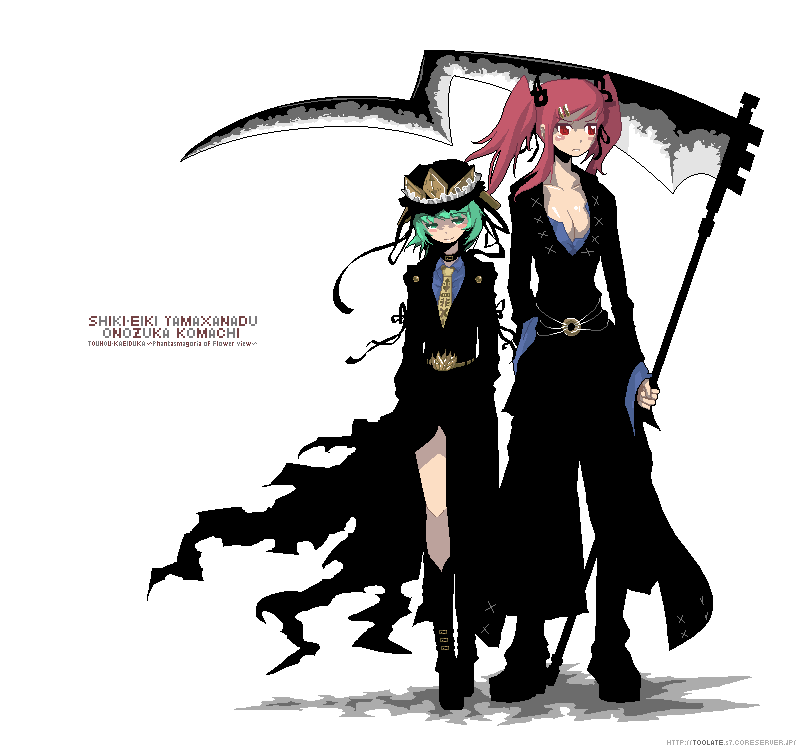 2girlsalternate costumealternate weaponbreastscleavagecontemporaryfemale focusformal clothesgreen hairmultiple girlsnecktiepixel artred hairrod of remorsescytheweapon