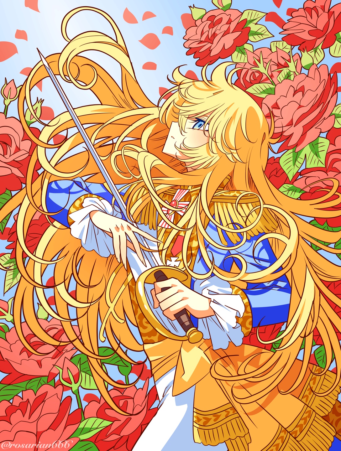 1girlblonde hairblue backgroundblue eyesblue jacketclosed mouthfloating hairflowerhair between eyesholdingholding swordholding weaponjacketlong hairlong sleeveslooking uppantsrapierred flowerred petalssolostandingstraight hairswordtwitter usernamevery long hairweaponwhite pants