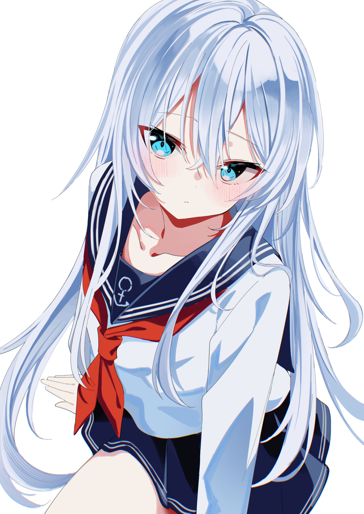 1girlblue eyesblue sailor collarblue skirtblushclosed mouthcollarbonecrossed bangshair between eyeslong hairlong sleeveslooking at viewerminiskirtneckerchiefred neckerchiefsailor collarsailor shirtshirtsimple backgroundsittingskirtsolostraight hairvery long hairwhite backgroundwhite hairwhite shirt