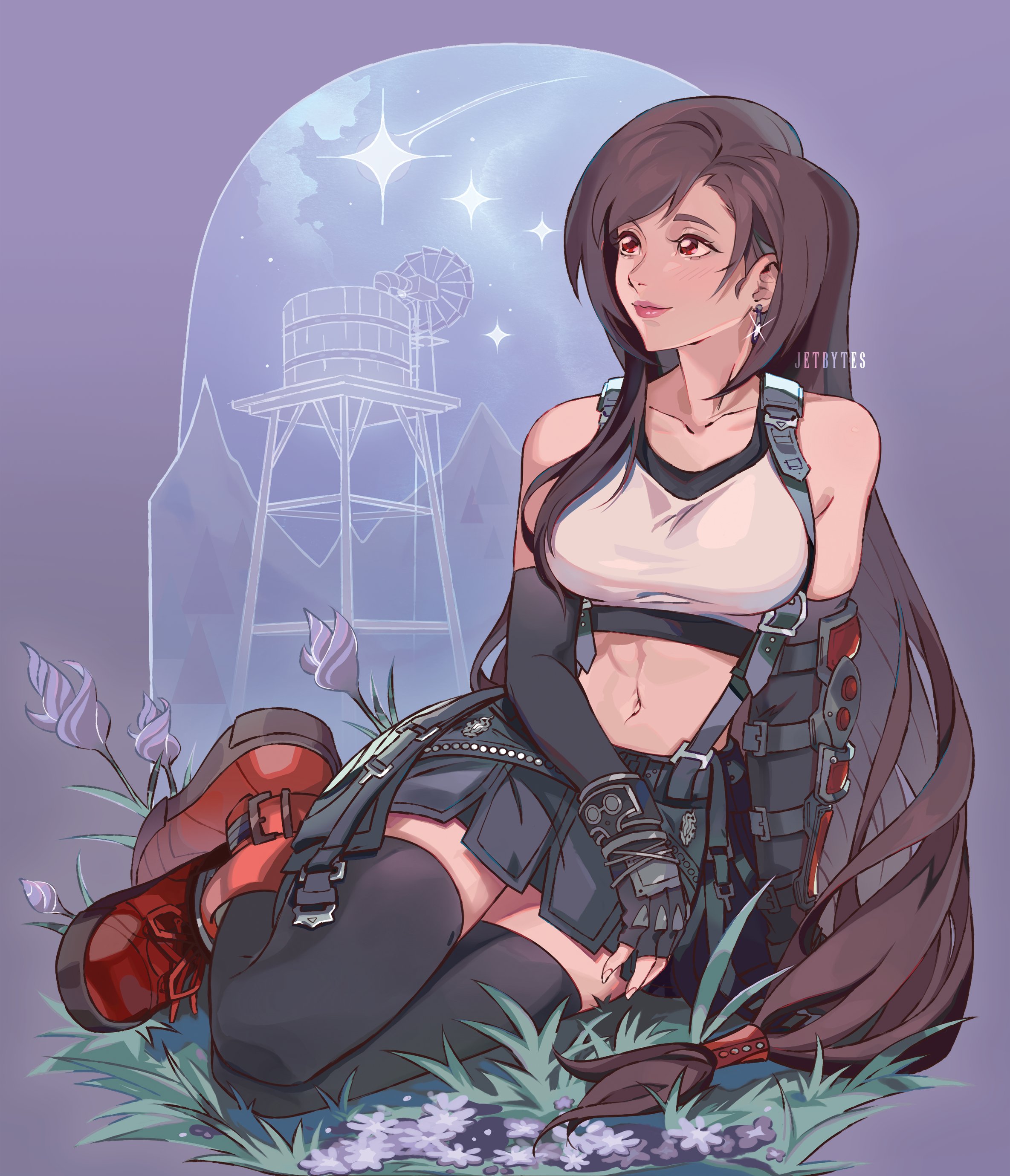 1girlbare shouldersblack glovesblack hairblack skirtblack thighhighsbootsbraceletbreastsclosed mouthcrop topearringsfingerless glovesflowerfull bodyglintglovesgrassjewelrylarge breastslipslong hairlooking to the sidelow-tied long hairmidriffminiskirtmountainous horizonnavelnibelheimnightnight skyred bootsred eyesred lipssingle arm guardsingle earringsittingskirtskysmilesolosparklestar (sky)starry skyswept bangstank topthighhighsvery long hairwater tankwater towerwhite tank topyokozuwarizettai ryouiki