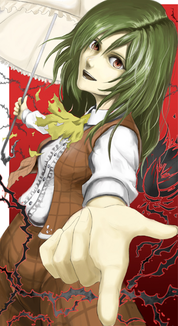 1girlascotfemale focusfinger gunforeshorteninggreen hairparasolplaid clothesplaid skirtplaid vestpointingred eyesshort hairskirtskirt setsolotorn clothesumbrellavest
