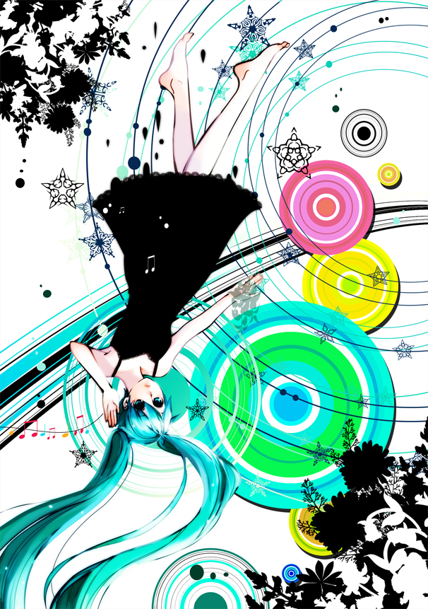 1girlaqua eyesaqua hairbarefootdressfeetfemale focuslong hairsolotwintailsupside-downvery long hair