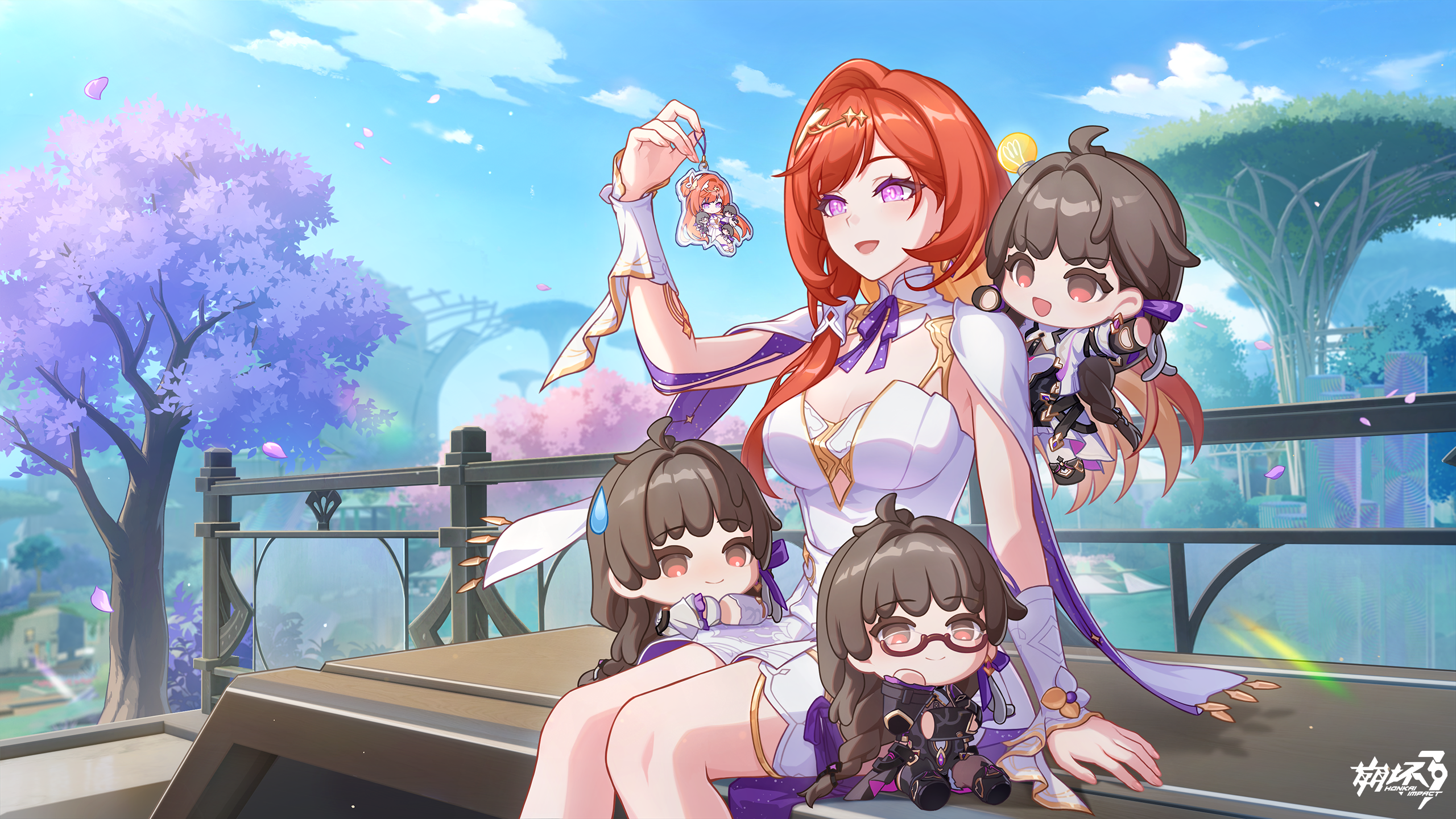 4girlsahogeblue skybreastsbrown haircharacter charmcharm (object)chibicleavagecloudcopyright logodressglassesholdingholding charmlarge breastslogolong hairmultiple girlson benchoutdoorspurple eyesred hairsittingskysmilesweatdroptreewhite dress