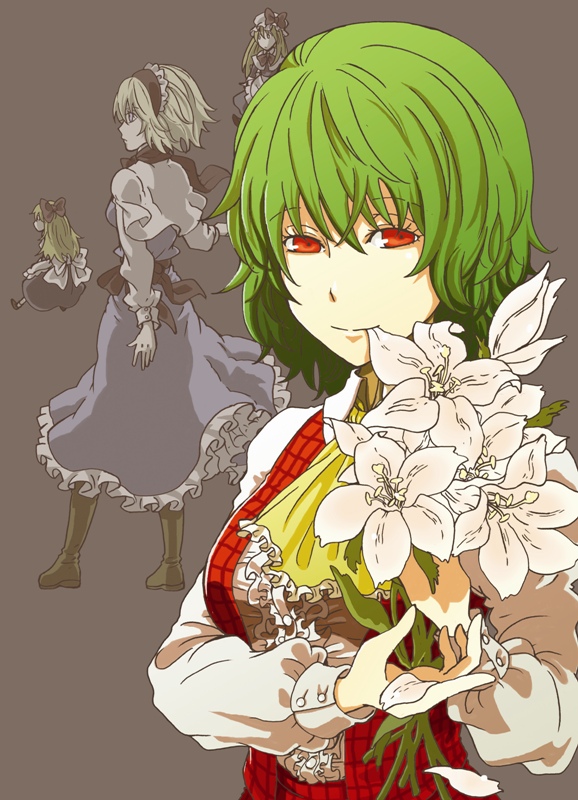 yamamoto kazue, mylene trantoul, ebenbourg no kaze, wind of ebenbourg, silver hair, highres, 00s, 1girl, adjusting hair, apron, blonde hair, broom, brown eyes, dress, female focus, maid, maid apron, pantyhose, solo, white pantyhose, yellow eyes