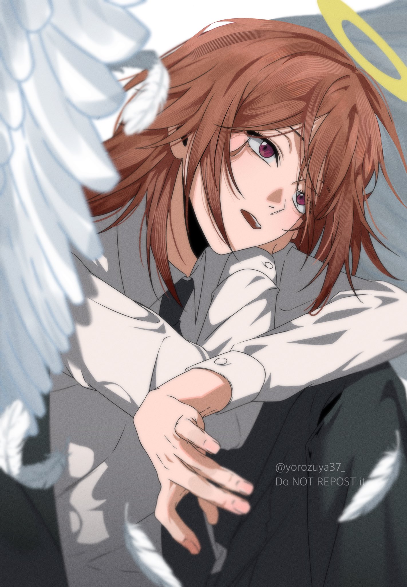 xiongji z z, yahata umiri, yahata umiri (moonlight executioner), arknights, bang dream!, bang dream! it's mygo!!!!!, absurdres, highres, 1girl, adjusting clothes, adjusting gloves, animal ears, black gloves, black hair, black jacket, blood, blood on face, blood on hands, blue eyes, chain, closed mouth, collared shirt, gloves, jacket, jacket on shoulders, kemonomimi mode, looking at viewer, medium hair, necktie, petals, red background, red necktie, shirt, solo, upper body, white shirt, wolf ears, wolf girl