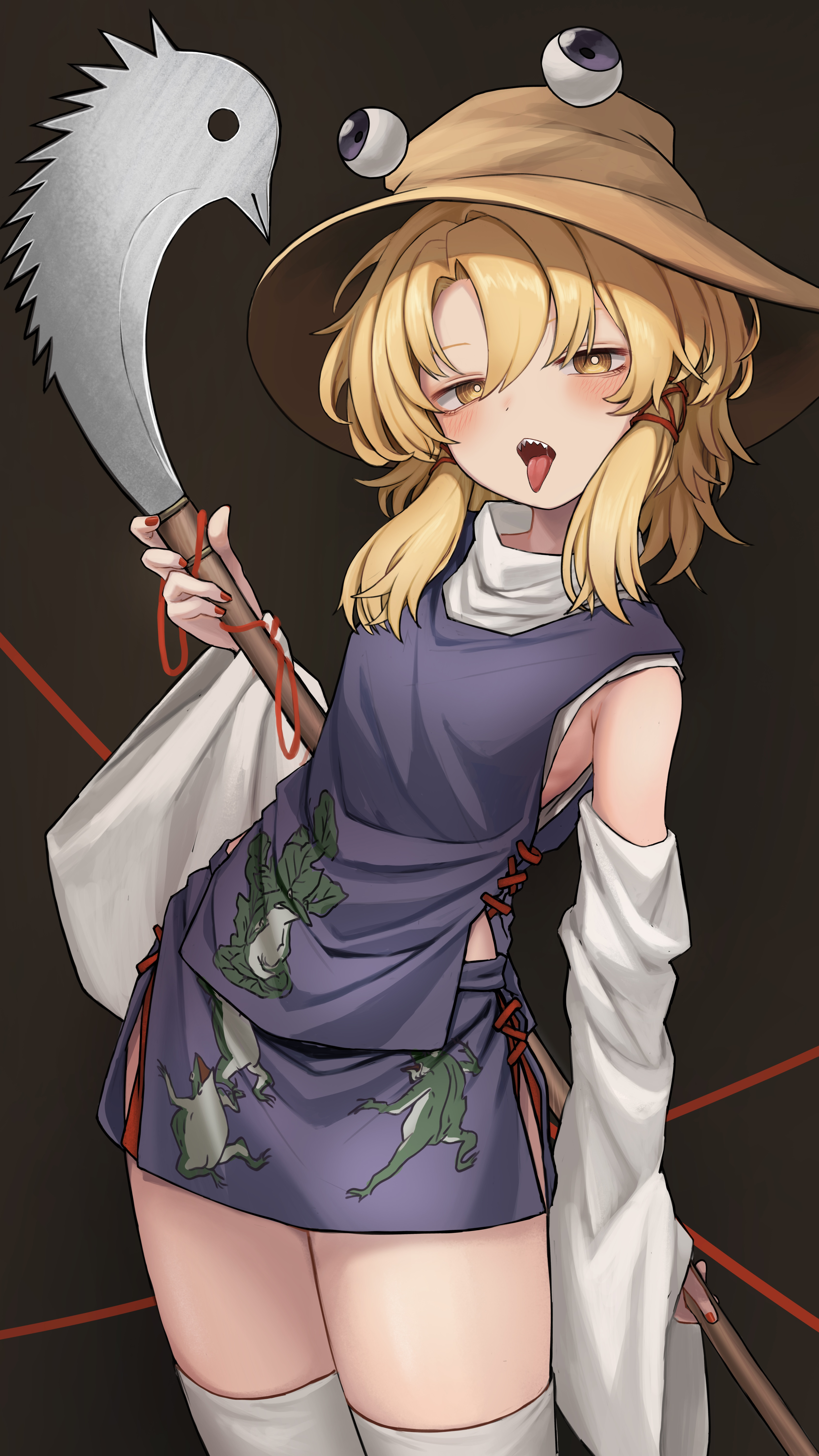 1girlanimal printblonde hairblue skirtblue vestbright pupilsbrown hatdetached sleevesfrog printhatholdingholding polearmholding weaponlooking at viewerminiskirtnaginatapolearmsaw bladeshirtsidelocksskirtsolothighhighstonguetongue outvestweaponwhite pupilswhite shirtwhite thighhighsyellow eyes