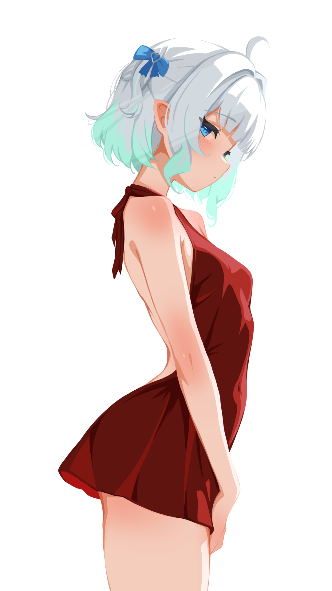 1girlahogebackless dressbackless outfitblue eyesbowdressgradient hairgreen hairhair bowhalter dresshalternecklooking to the sidemulticolored hairpointy earsred dressshort hairsimple backgroundsolotwo side upvirtual youtuberwhite backgroundwhite hair