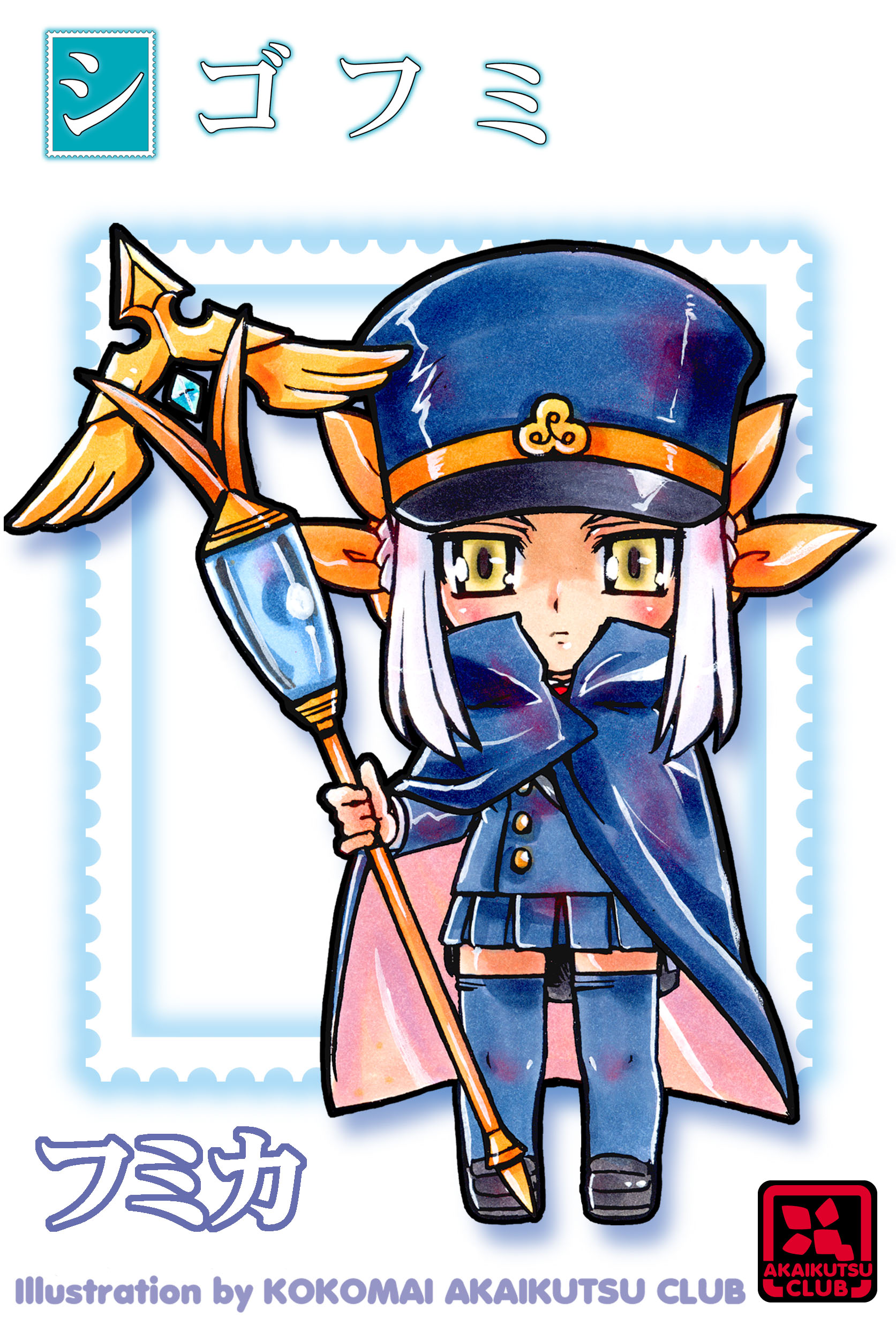 1girlartist namebagblack shoesblue capeblue hatblue jacketblue skirtblue thighhighsbowcapecharacter namechibichibi onlycircle nameclosed mouthcopyright nameexpressionlessfull bodyhair bowhatholdingholding staffjacketlooking at viewermedium hairpink capepleated skirtsatchelshako capshoesskirtsolostaffstandingthighhighstwo-sided capetwo-sided fabricwhite hairyellow bowyellow eyeszettai ryouiki