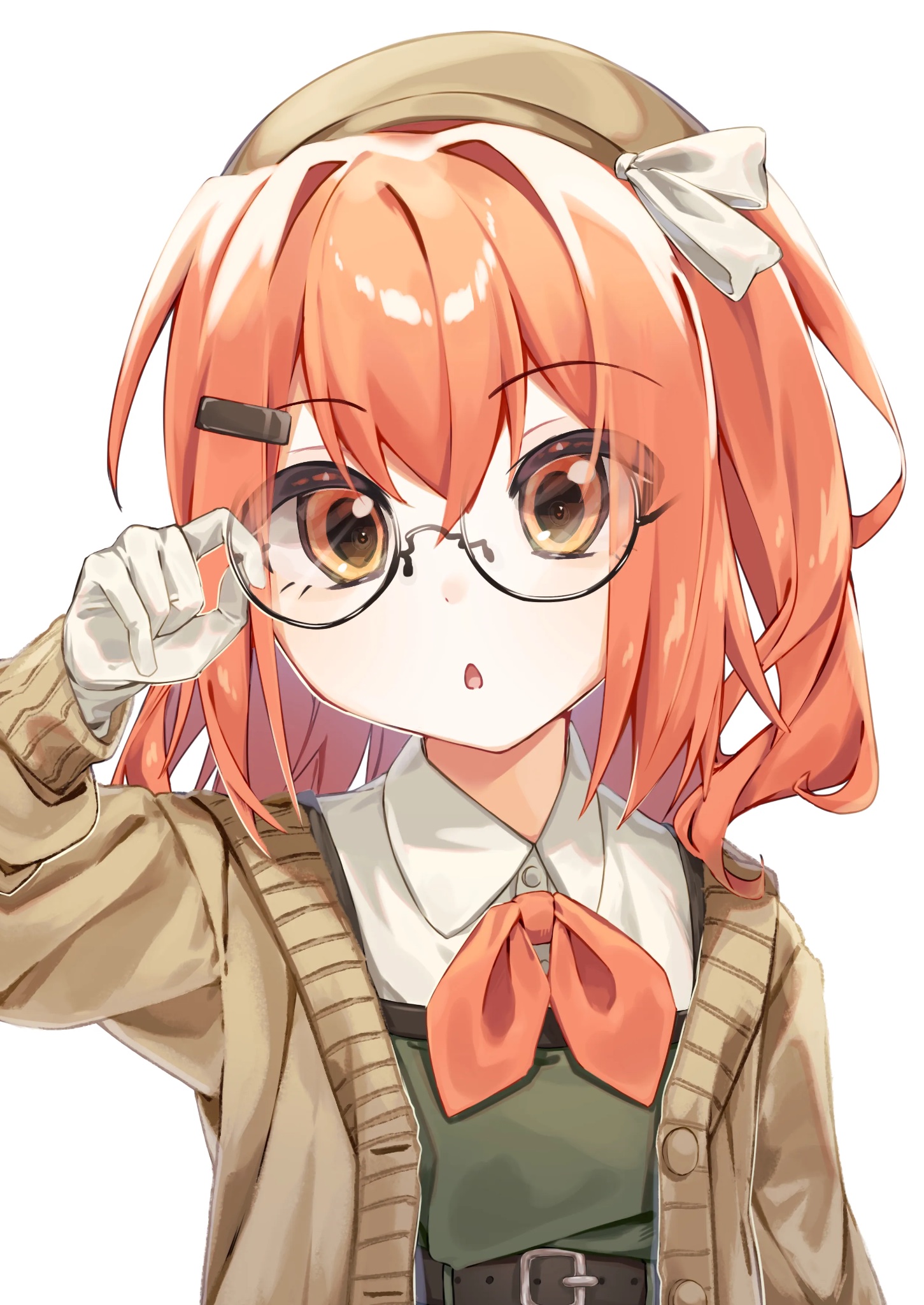 1girladjusting eyewearalternate costumebespectacledbrown cardigancardigancollared shirtglasseslong sleeveslooking at viewerneckerchiefopen cardiganopen clothesorange eyesorange hairorange neckerchiefparted lipsshirtsimple backgroundsoloupper bodywhite background