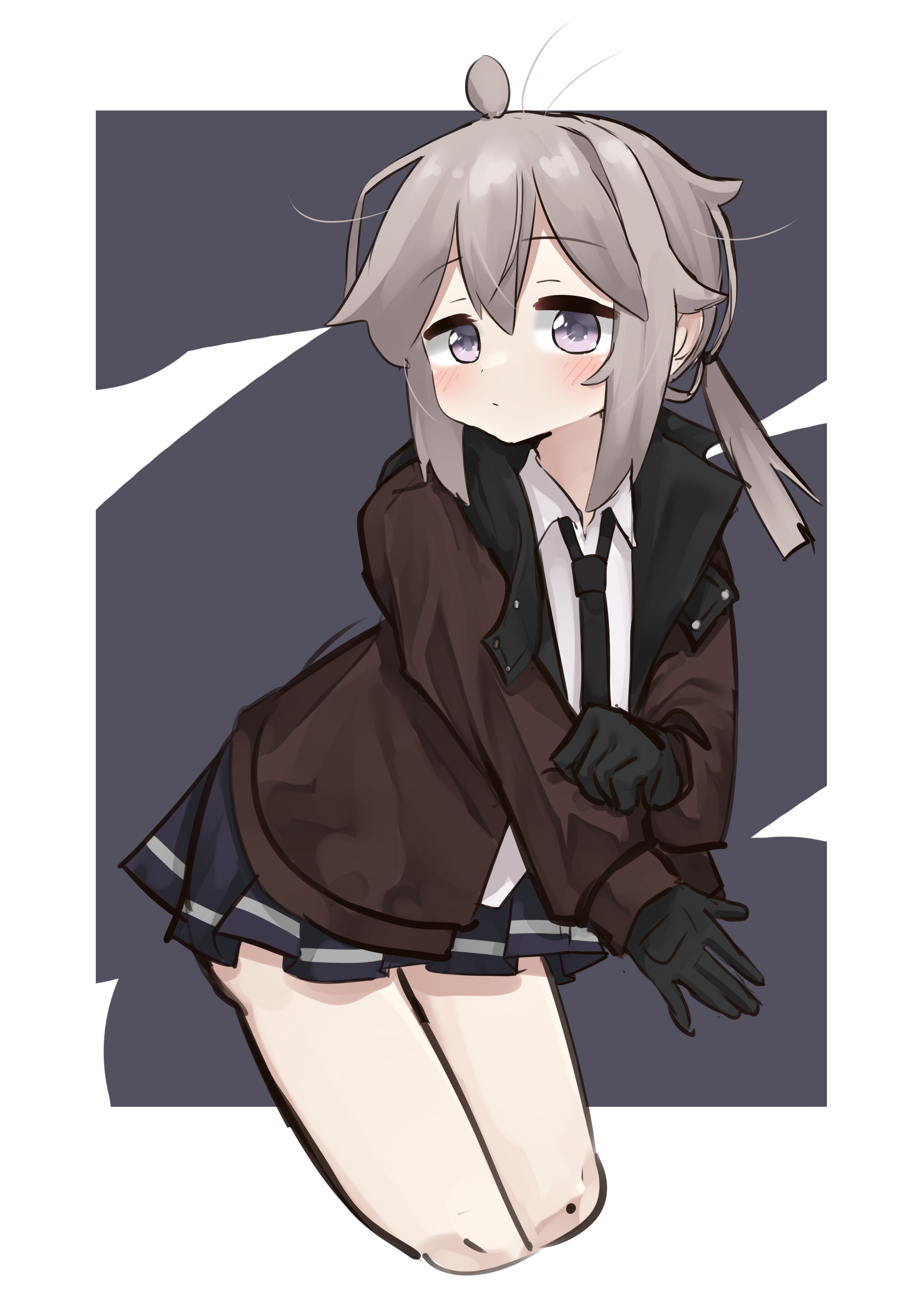 1girlahogeblack glovesclosed mouthcollared shirtglovesholding own armjacketnecktieopen clothesopen jacketponytailshirtsimple backgroundwhite shirt