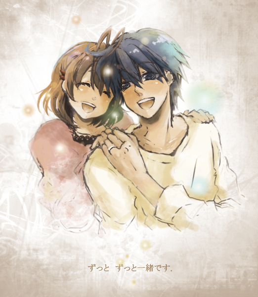 00s1boy1girlantenna hairblue eyesblue hairbrown hairclosed eyeshappyhusband and wifejewelryringshort hair