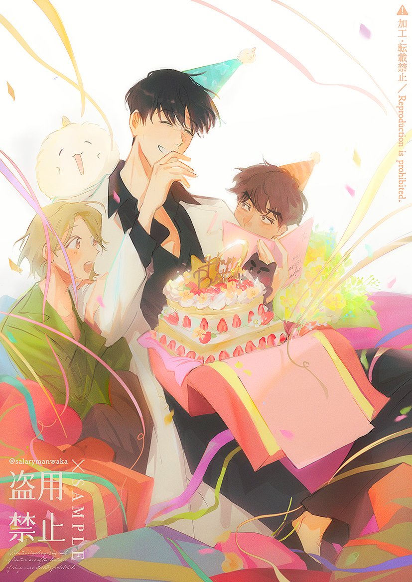 :d1girl2boysanimalanimal on shoulderanimalizationbirthday cakeblack hairblack shirtblonde hairblushbrown haircakecatcoatcollared shirtconfettifoodfull bodygreen shirtgrinhand on own chinhappy birthdayhathead tiltknees uplooking at anothermultiple boysopen boxopen mouthparty hatshirtshort hairsittingsmilestrawberry cakestreamerswhite coat