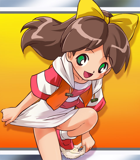1girlblushbowbrown hairdressfemale focusgreen eyeshair bowhappyleg uplolilong hairlooking at viewerno pantiesopen clothesopen vestponytailpussypussy peekskirtsolostandingstanding on one legtaremeundressingvestwhite dress