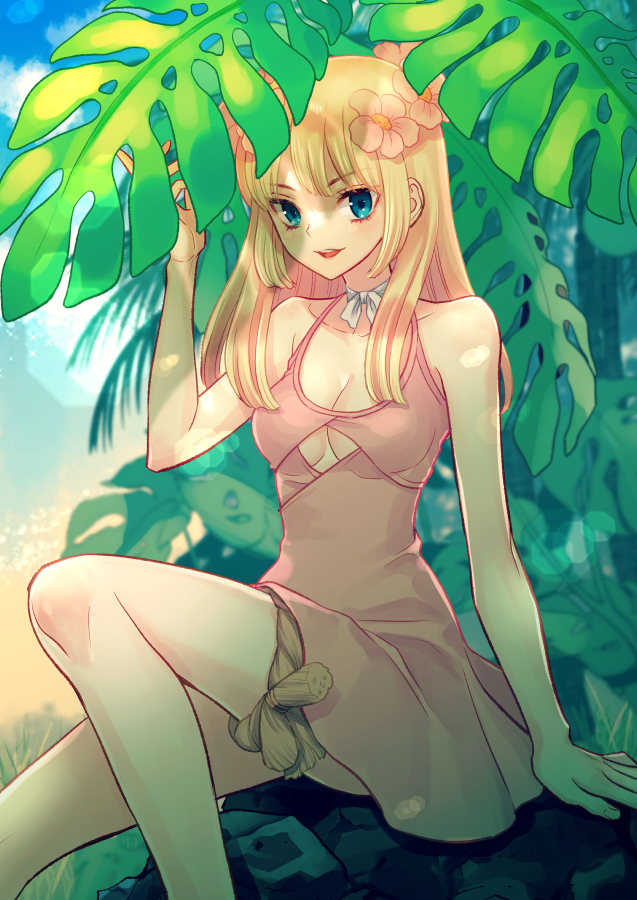 1girlblonde hairblue eyesbreastschokerdecaldressflowerfull bodyhair flowerhair ornamenthand upleafleaf backgroundlong hairmedium breastsopen mouthpink dresssittingsmileta ra mo