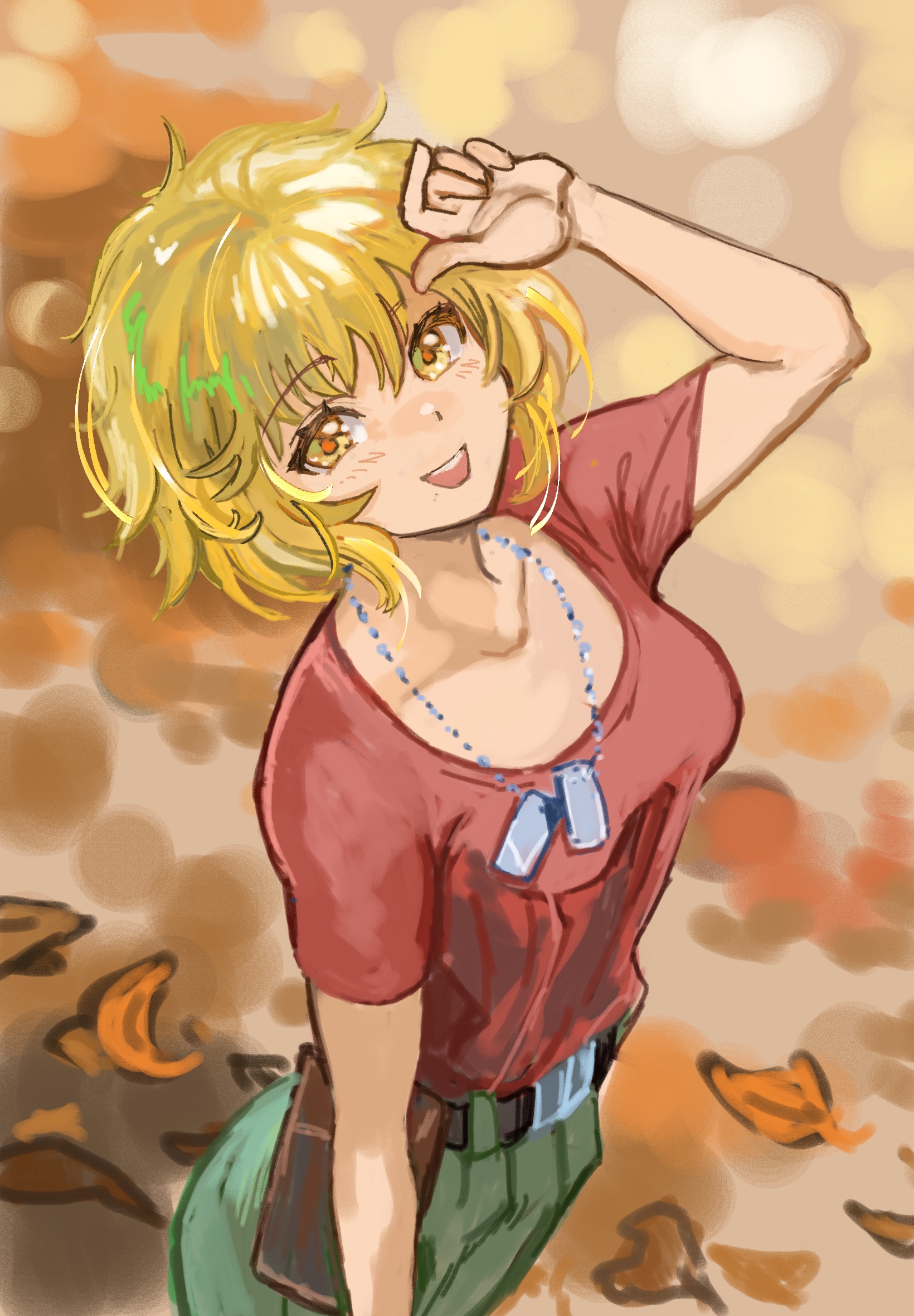 1girlbeltblonde hairbreastscollarbonedog tagsgreen pantsholsterleaflooking at viewerpantsred shirtshirtshort hairsmilesoloyellow eyes