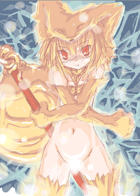 1girlanimal earsblonde hairbrabreastsbreasts squeezed togethercensoredelbow glovesfangfemale focusfox earsgloveshatlingeriemidriffno pantiesoekakired eyessmall breastssolostaffthighhighsunderwear