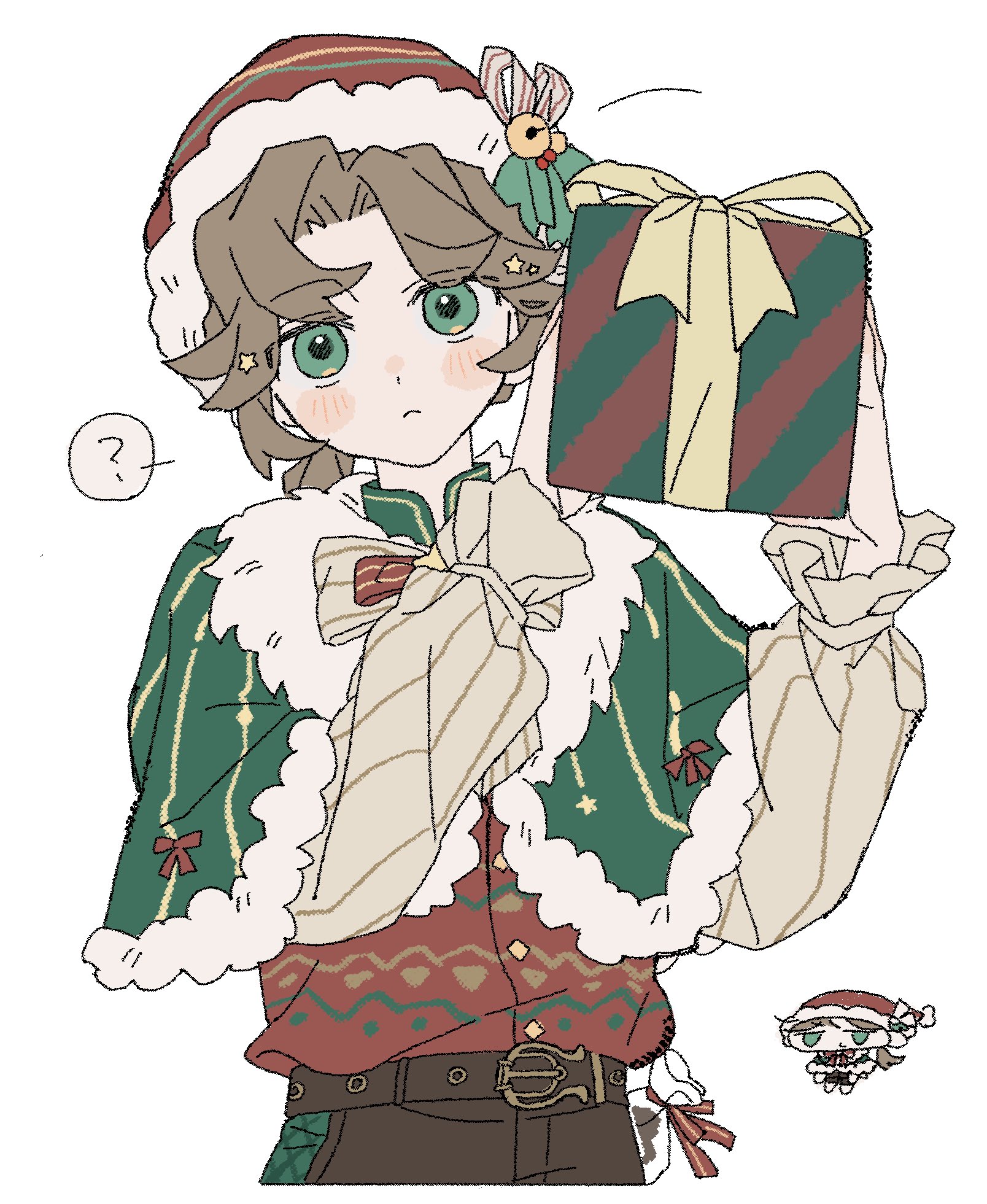 1boybellbeltblushboxbrown beltbrown haircapeletclosed mouthfur trimfur-trimmed capeletfur-trimmed headweargiftgift boxgreen eyeshair ornamenthatholdingholding giftlong sleeveslooking at viewermale focuspantsparted bangsred capeletsanta costumesanta hatshirtshort hairsolospoken question markstar (symbol)vestwhite background