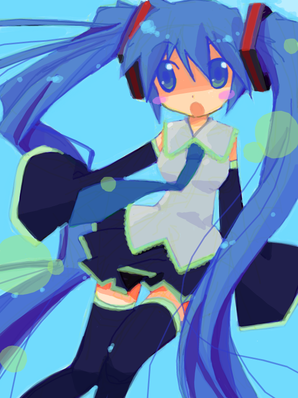 :o1girlblue eyesblue hairblushdetached sleevesfemale focuslong hairmatching hair/eyesskirtsolothighhighstwintailsvery long hair
